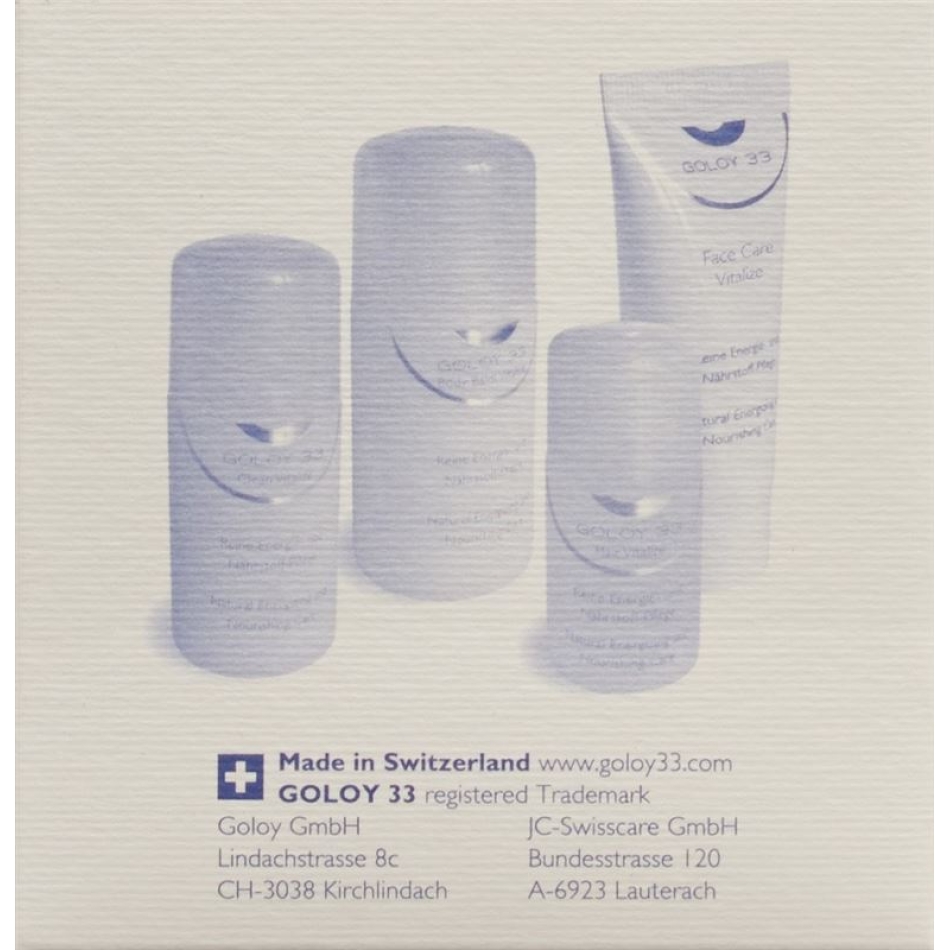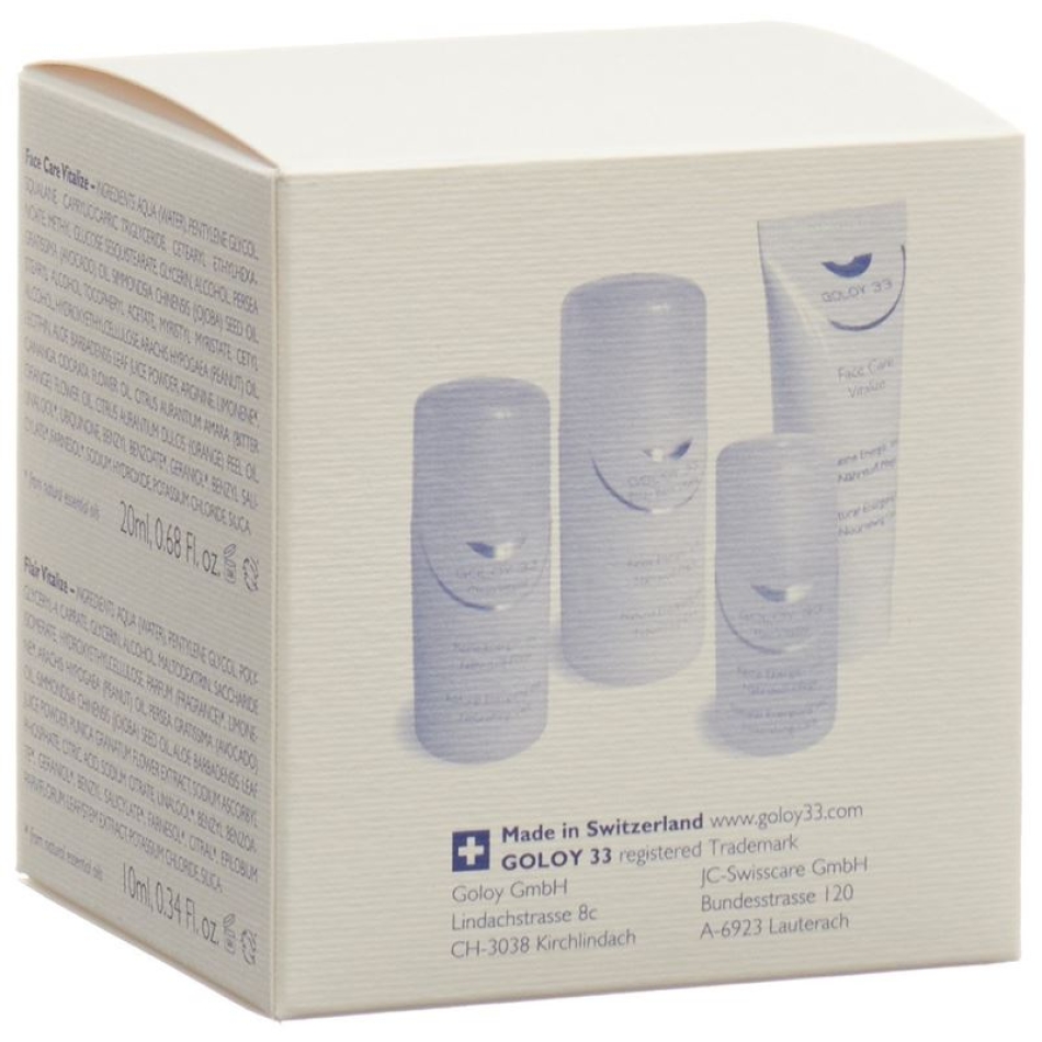 Das Goloy 33 Reiseset 4 Stück besteht aus Produkte der natürlichen Energie- und Nährstoff-Pflegelinie für ein ausgewogenes Hautklima.