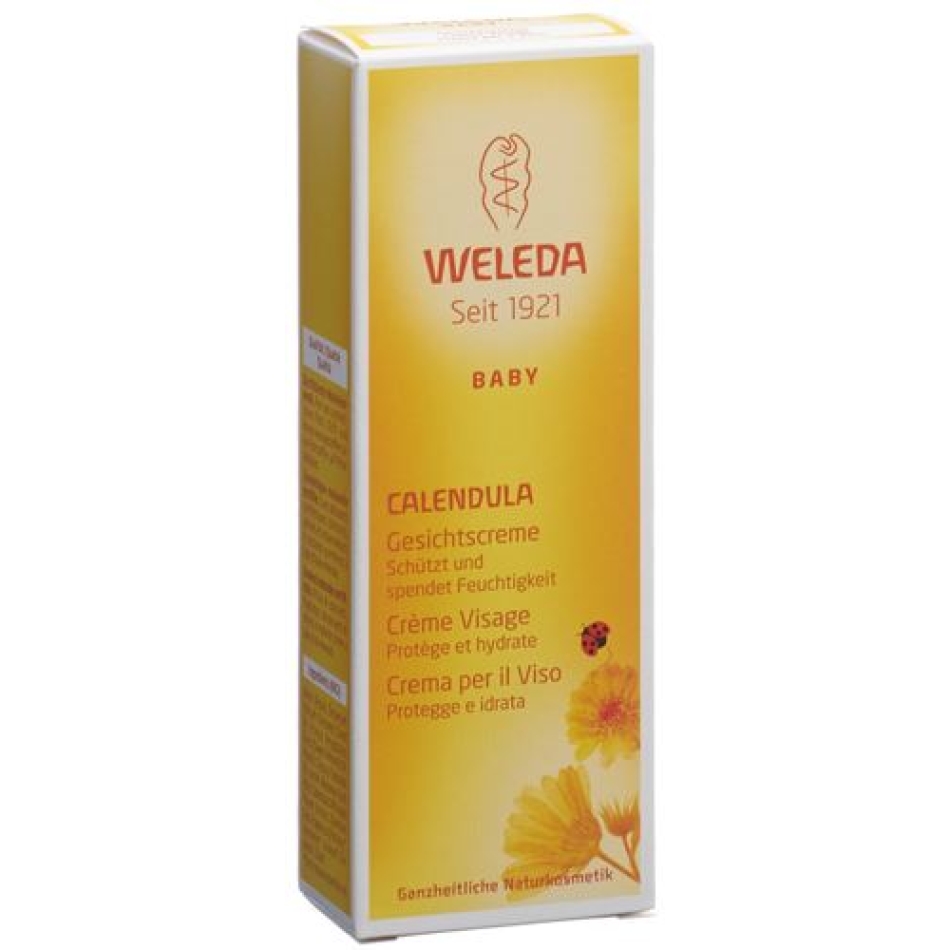 Die Weleda Baby Calendula Gesichtscreme unterstützt die natürlichen Hautfunktionen und hält dank der Kombination von Mandelöl und Bienenwachs die Haut geschmeidig und schützt sie vor dem Austrocknen. Ein Pflanzenauszug aus Calendula beruhigt zudem die empfindliche Babyhaut.