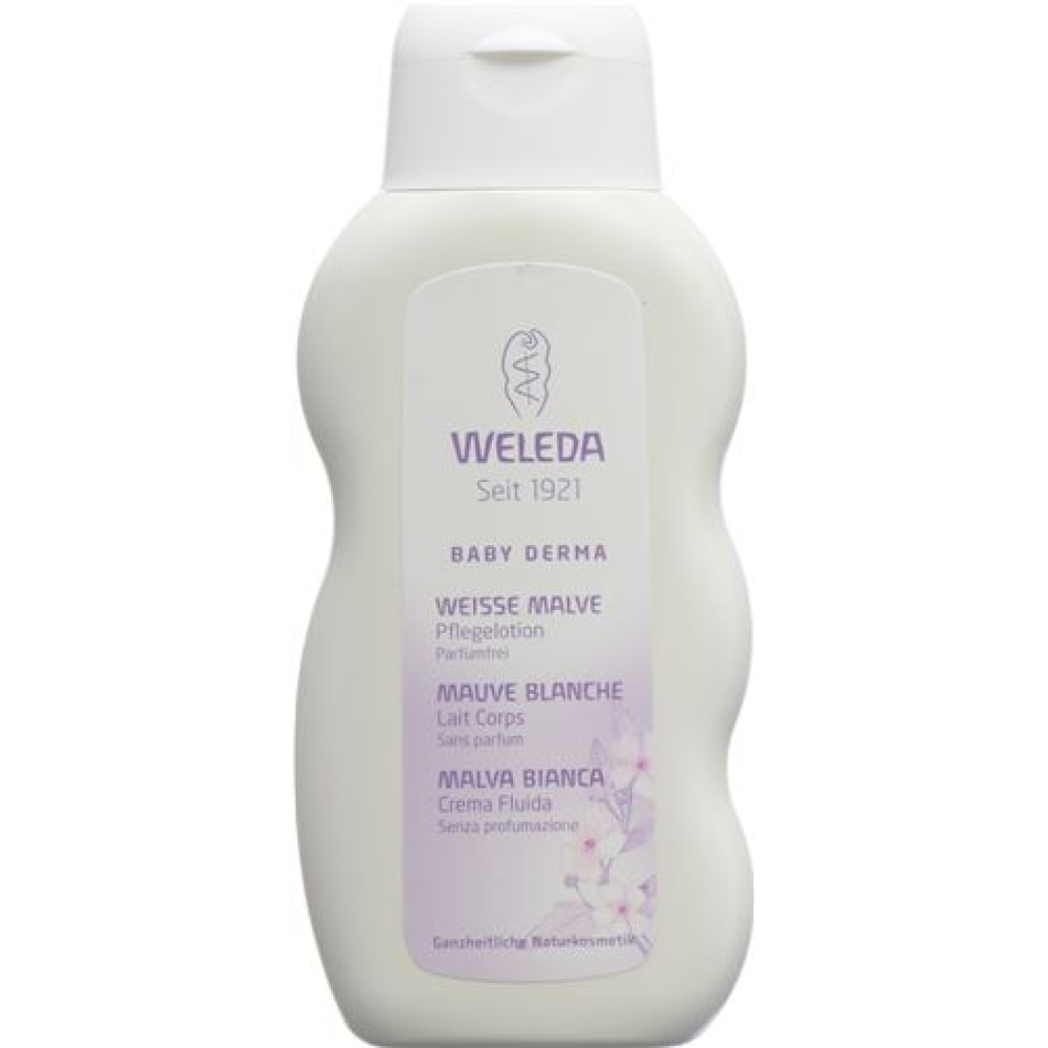 The unscented Weleda Baby Derma White Mauve Care Lotion with valuable extracts from the White Organic Mauve and Pansy provides highly sensitive baby skin with intensive moisture and gently soothes skin irritations. Rich organic coconut oil and sesame oil also intensively care for the skin and envelop irritation-prone skin with a soothing protective coat.