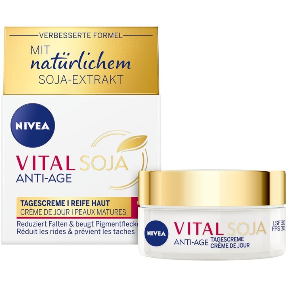 Die Nivea Vital Soja Anti-Age Schützende Tagescreme mit dem integrierten Lichtschutzfaktor 30 beugt lichtbedingter Hautalterung noch besser vor und reduziert Falten und Linien sichtbar. Dank dem natürlichen Soja-Extrakt ist die Haut straffer und die Gesichtskonturen werden verbessert. Sie sorgt für einen ebenmässigeren Hautton und verleiht ein frisches und verjüngtes Aussehen.