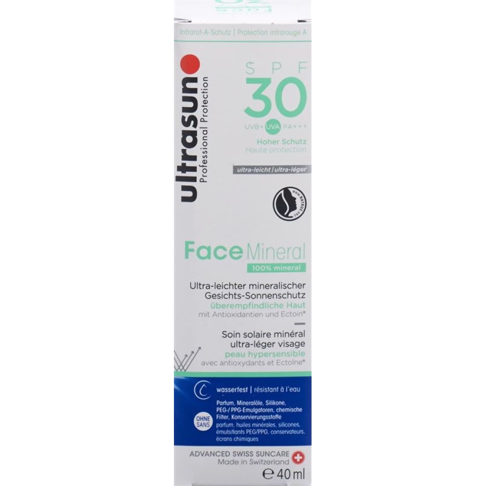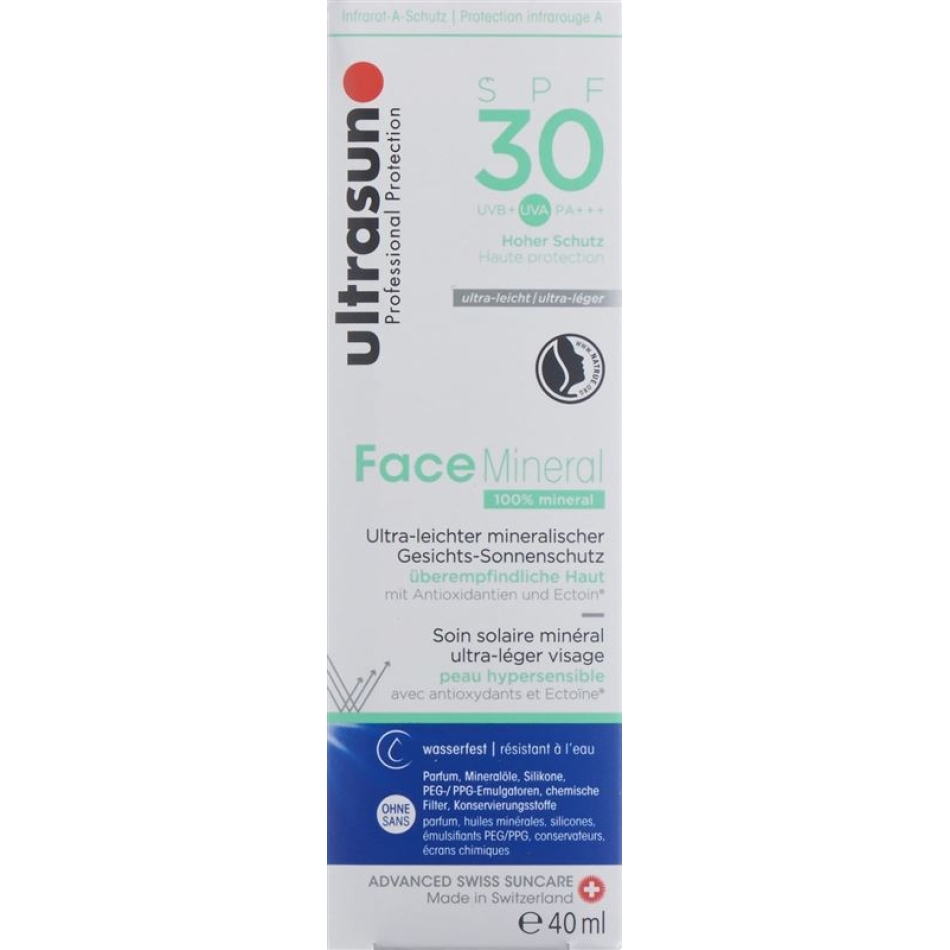 Ultrasun sun protection is quickly absorbed, does not grease and is not sticky. An ultra light, almost invisible mineral face sunscreen. The product contains UVA and UVB filters and InfraGuard for protection against infrared and ectoin. In addition, the sunscreen provides optimum moisture and reduces the effects of sun-related ageing. Suitable for hypersensitive skin as sun protection and moisturizer. Can be applied to face, neck and décolleté.