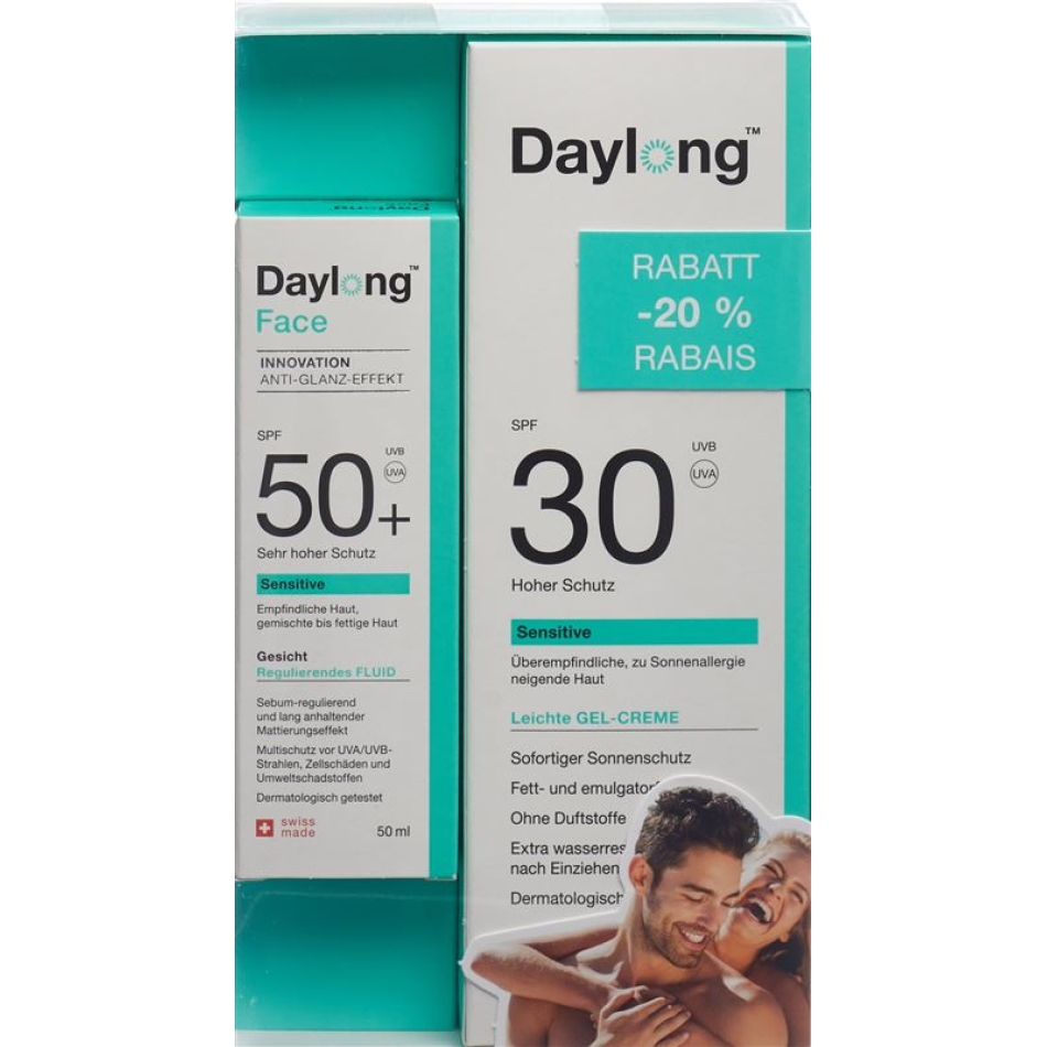 In addition to the Daylong Sensitive Gel Cream SPF 30 200ml, this pack contains a Sensitive Face Gel Fluid SPF 50+.